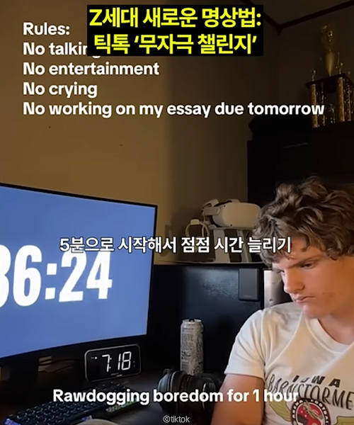 최근 틱톡을 이용하는 Z세대 사이에서 '지루함 견디기', 즉 '무자극 멍때리기'(Raw Dogging Boredom) 챌린지가 유행하고 있습니다. 말 그대로 아무런 자극 없이 지루함을 정면으로 마주하는 챌린지인데요. 일정 시간 동안 타이머를 맞추고, '아무것도 하지 않는 시간'을 보내며 휴대폰으로 타임랩스를 찍으면 되는 아주 간단한 챌린지입니다.