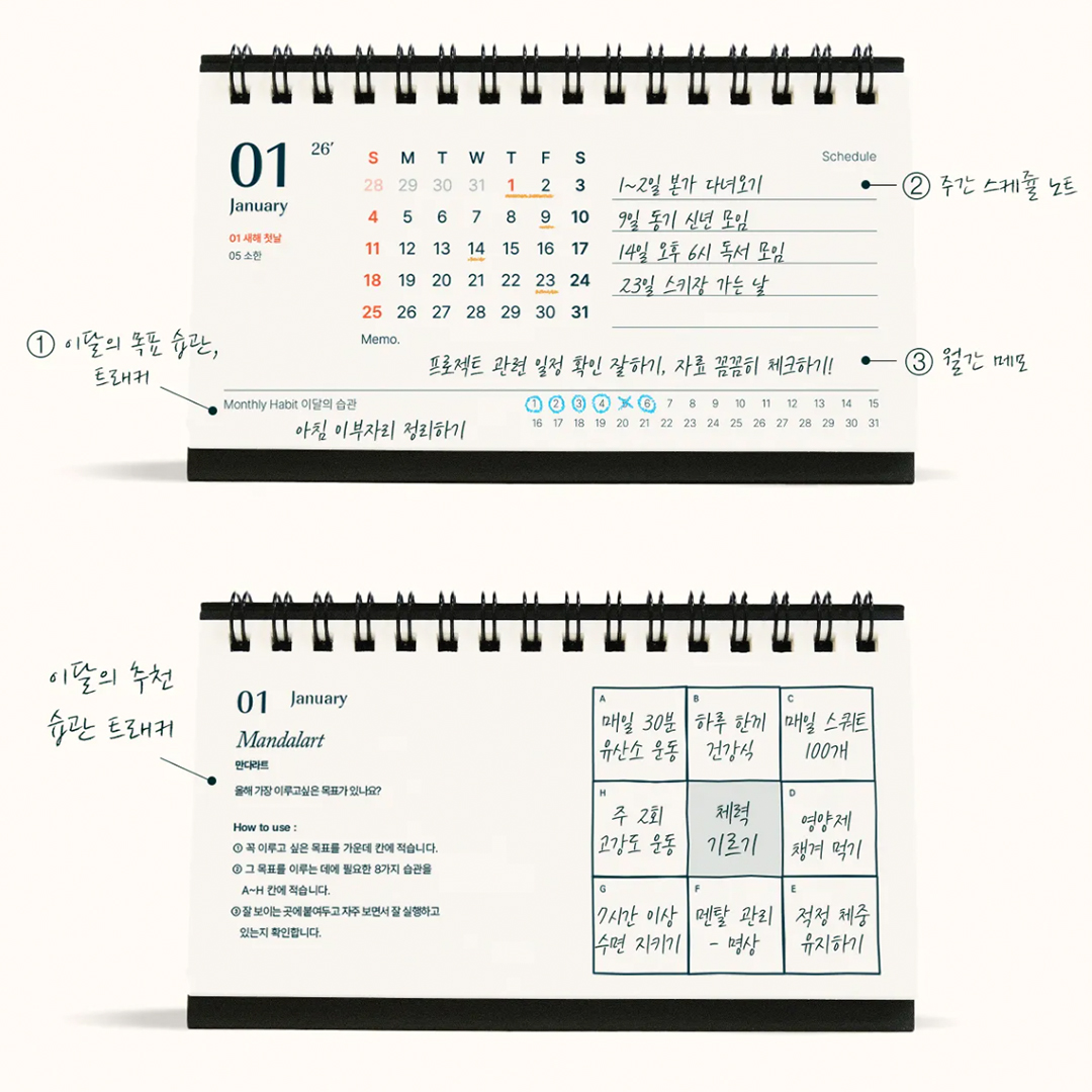 콤팩트한 사이즈에 다양한 기능으로 꽉 채운 탁상용 캘린더입니다. 앞면엔 위클리 스케쥴을 적을 수 있고, 하단에는 '이달의 목표 습관'을 적어두고 매일 체크할 수 있는 트래커가 포함되어 있어요. 뒷면은 2025년 12월부터 2026년 12월까지 매월 각기 다른 열 세가지 종류의 커버서울이 제안하는 '이달의 습관 트래커'로 구성되어 있습니다. |
