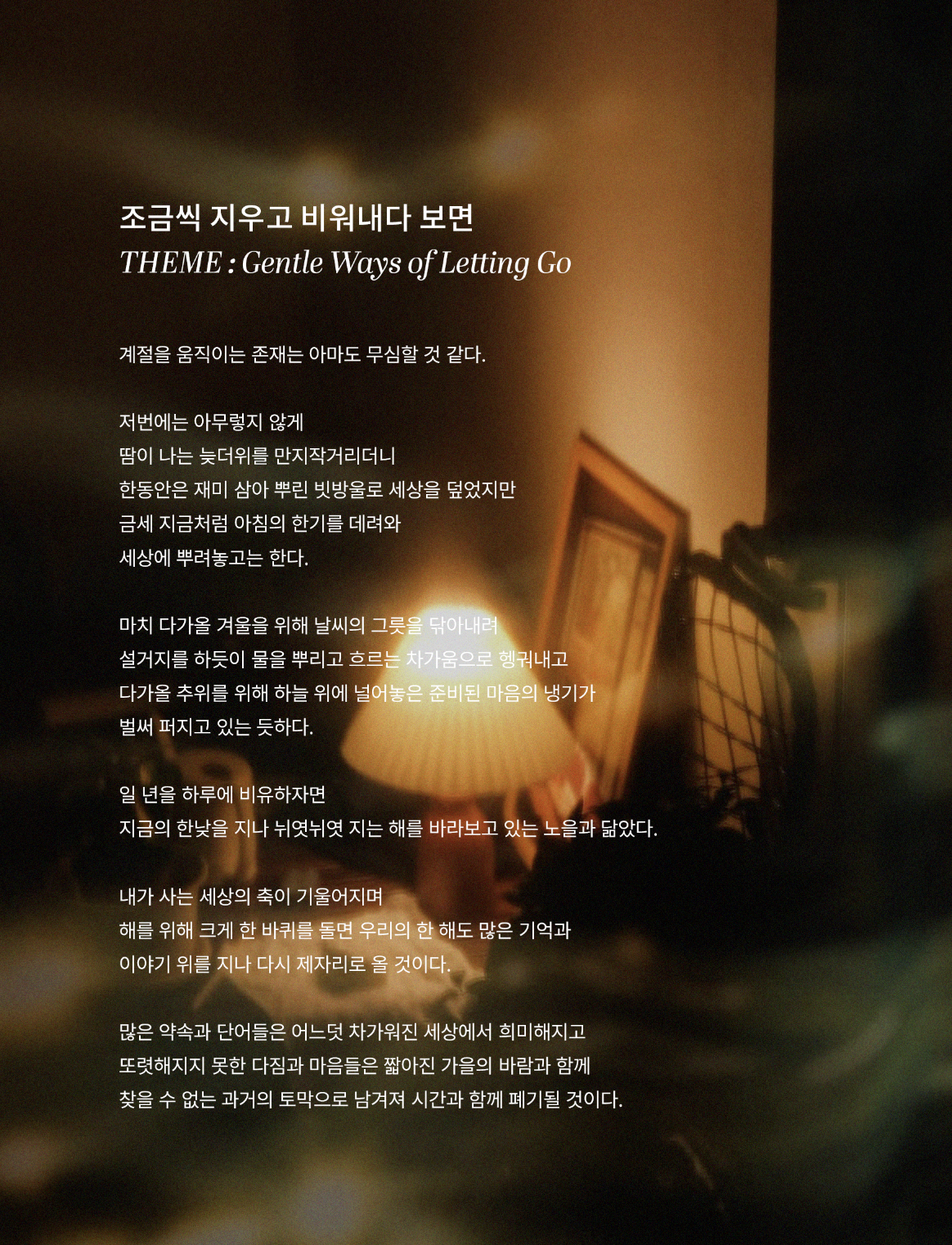 모든 것이 희미해지는 이 계절이 되어서야 비로소 더 선명해지는 것들이 있습니다. 바로 내 삶에 더할 것과 덜어낼 것입니다.