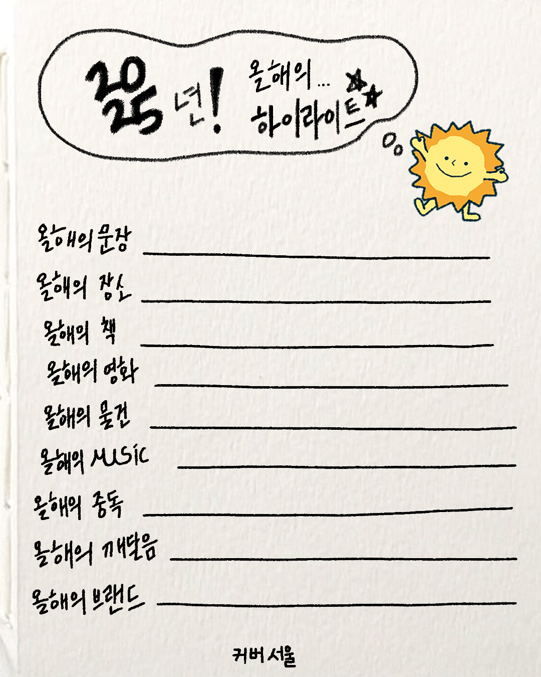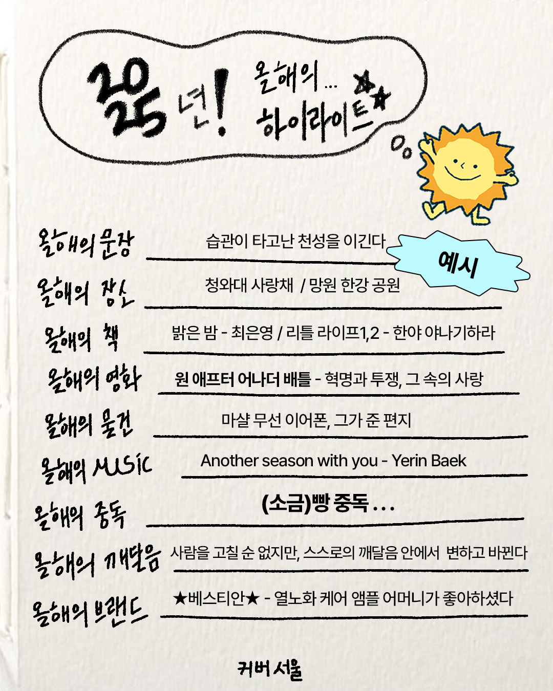 ⇢ 올해의 ( ) ________. ⇢ 장소 / 영화 / 노래 / 음식 / 책 / 브랜드 / 중독 등 키워드에 떠오르는 한 가지씩을 적어보세요. |