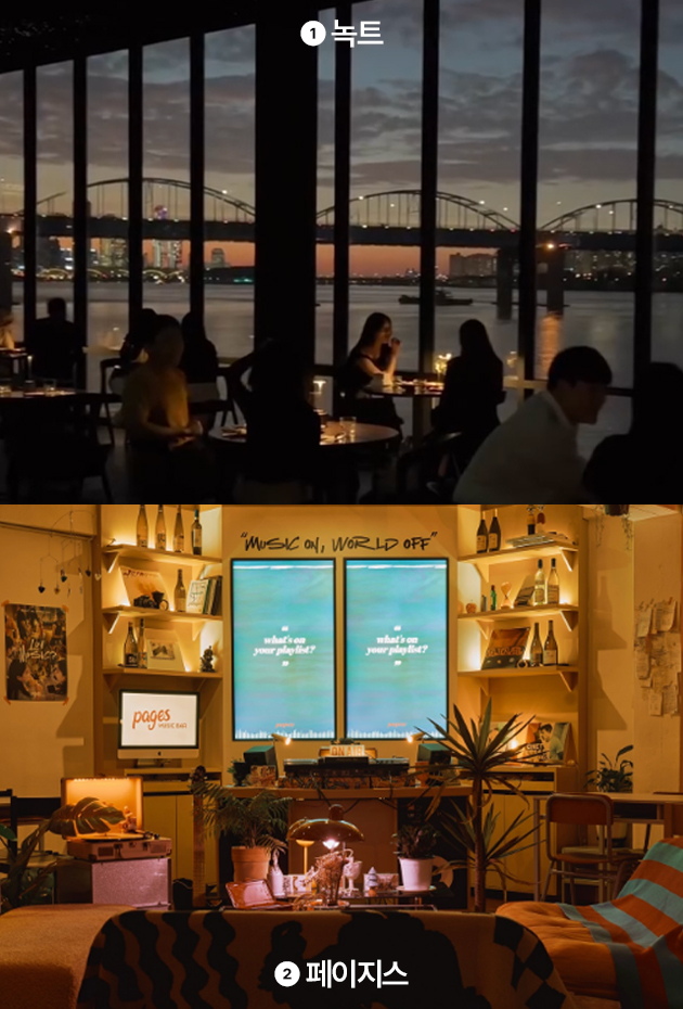 ❶ 녹트 | 서울 용산구 올림픽대로 2085-96 THE RIVER 2층 : 밤하늘의 별처럼 반짝이는 서울의 야경과 그 빛이 아름답게 일렁이는 한강. 라이브 재즈 선율을 배경 삼아 깊은 대화를 나눠보세요.