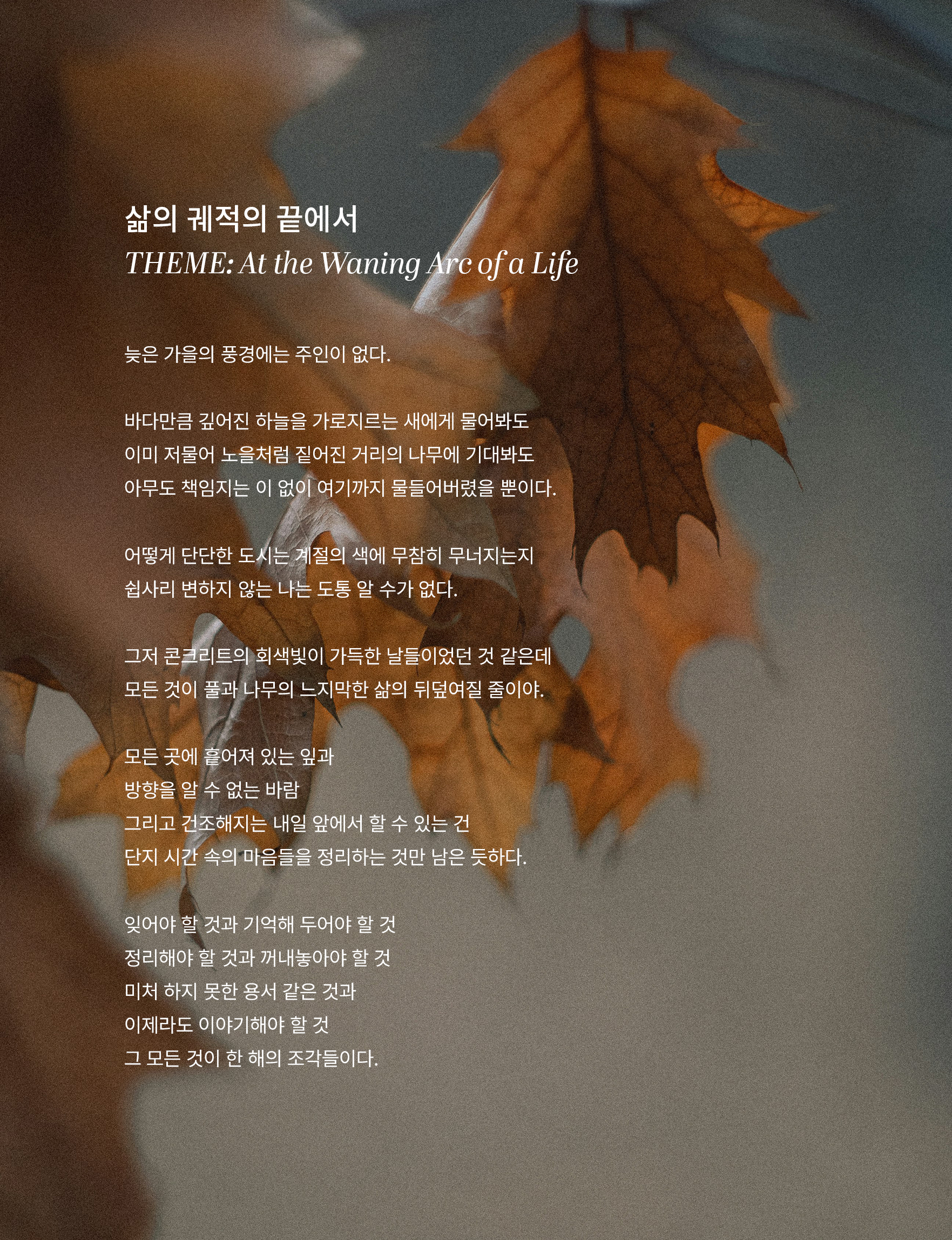 하지만 차갑고 건조하기만 한 바람이 몸을 움츠러들게 만드는 계절이 오면 오히려 마음 한구석이 조금 느슨해집니다. 그동안 외면했던 감정들은 어둠 속에서 하나씩 고개를 들고, 흔들림 없던 시선과 발걸음은 왠지 앞보다는 주변을 둘러보게 합니다.