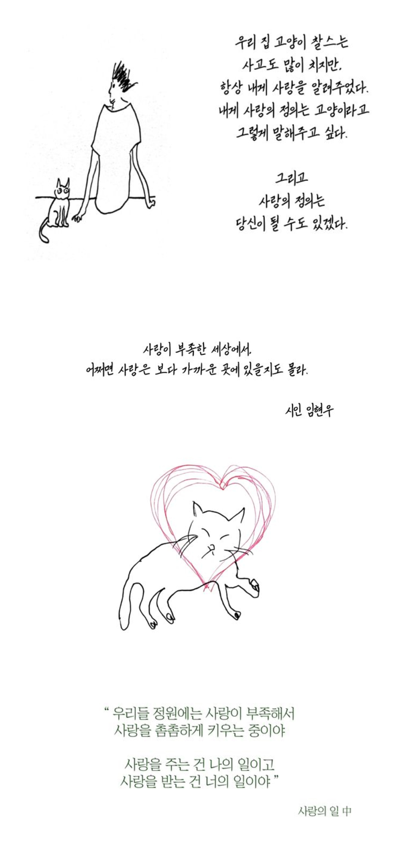 『사랑의 정의는 고양이』 열심히 살아가는 것이 점점 지치고, 차가워지는 세상에서 우리는 많은 것들을 잊어가며 살아갑니다. 그리고 사랑의 정의도 잊어갑니다. 사랑의 정의가 되는 말들은 생각보다 주변에 많을지도 모릅니다. 저에겐 사랑하는 할머니, 고양이, 연인이 사랑의 정의였고 이미 과거형이 되었지만 여전히 사랑의 정의가 되는 말들이 있습니다. 꼭 연인과의 사랑만이 사랑의 정의가 되는 게 아니라고 그렇게 믿습니다. 많은 독자분들이 잊고 지내었던 사랑의 정의가 되는 말들과 따뜻하게 살아갔으면 하는 마음에 이 책을 내게 되었습니다.