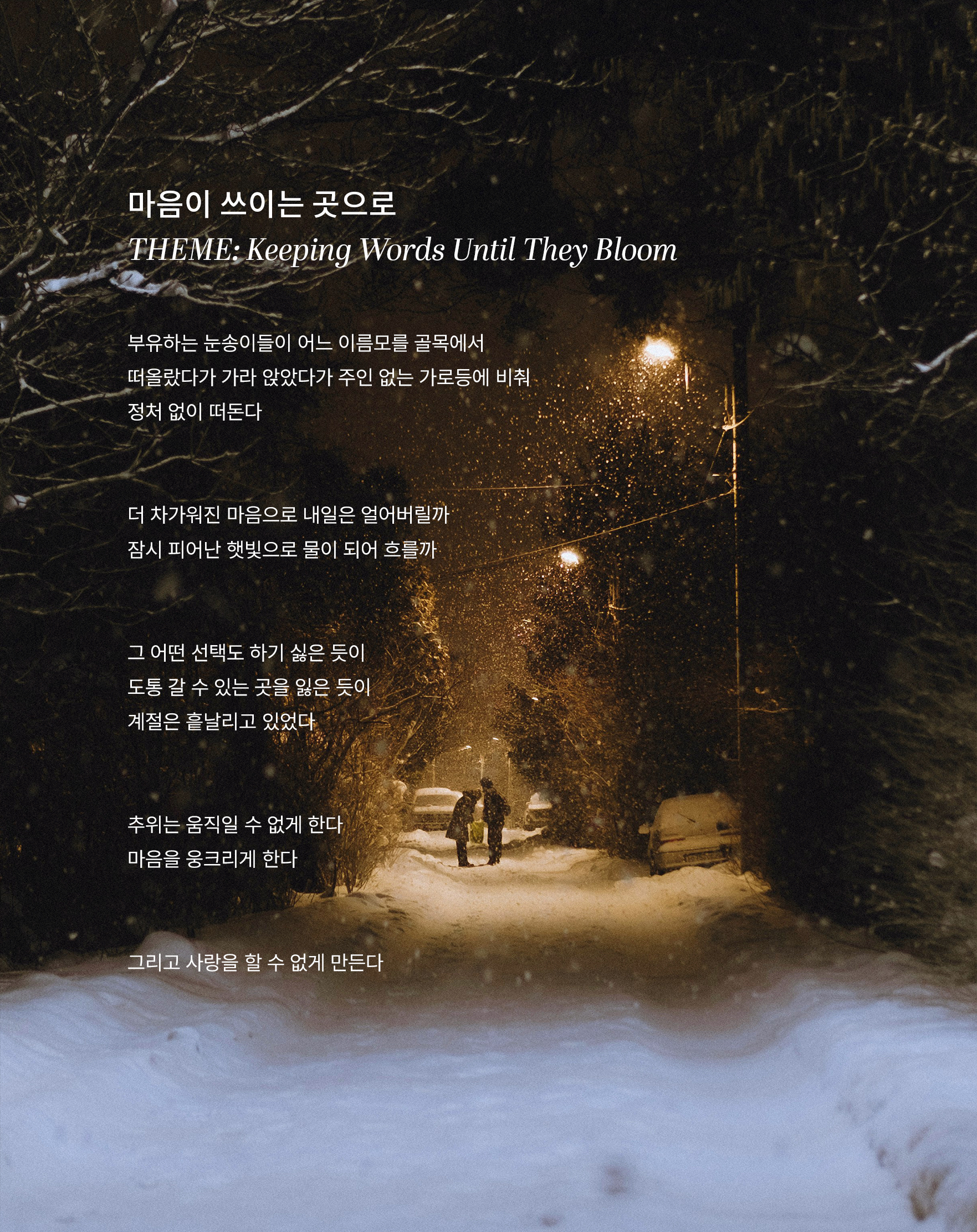 "손을 잡지 않아도 지저귀는 마음은 차마 숨길 수 없습니다. 그저 날이 참 좋다고 말 한마디 건넬 수밖에요."